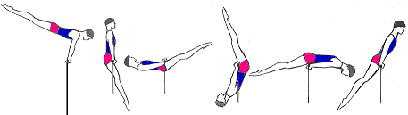 Man startet im Stützt und holt zu erst Schwung, in dem man die Beine hinten über die Stange hoch schwingt. Der Körper ist gespannt und die Arme müssen immer ausgestreckt bleiben, durch die ganze Übung. Dann geht man mit der Hüft zur Stange in die C+ Pose und dreht sich einmal rückwärts um die Stange bis wieder in den Stützt.